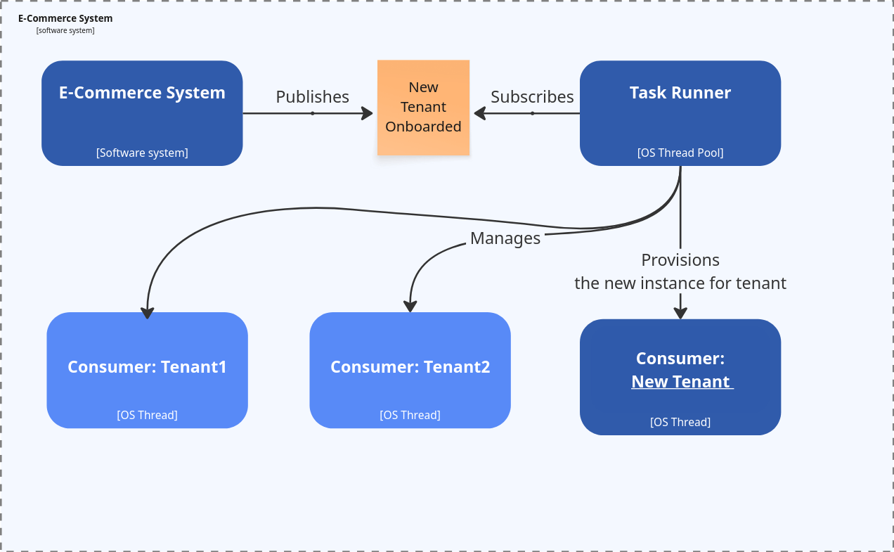 }Of course, this wouldn’t be fully dynamic, but we could make it dynamic at the infrastructure level, e.g., by passing the tenant ID from an environment variable and spinning up a new Container (e.g., a Kubernetes Pod).