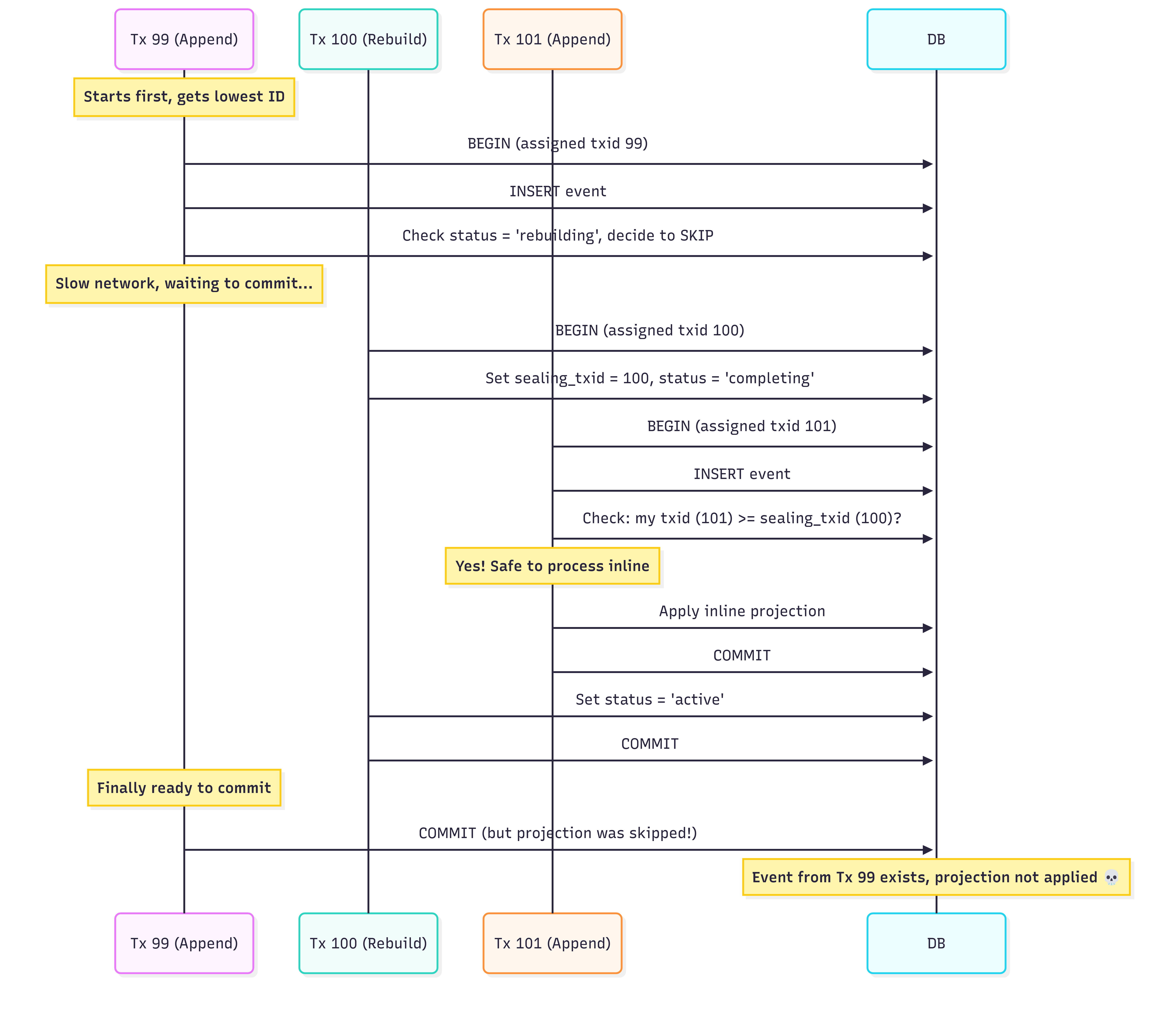 - Tx 101 started third. It checked: “Is my transaction ID (101) >= sealing_txid (100)?” Yes, so it assumed the read model was ready and processed its inline projection. It committed successfully.