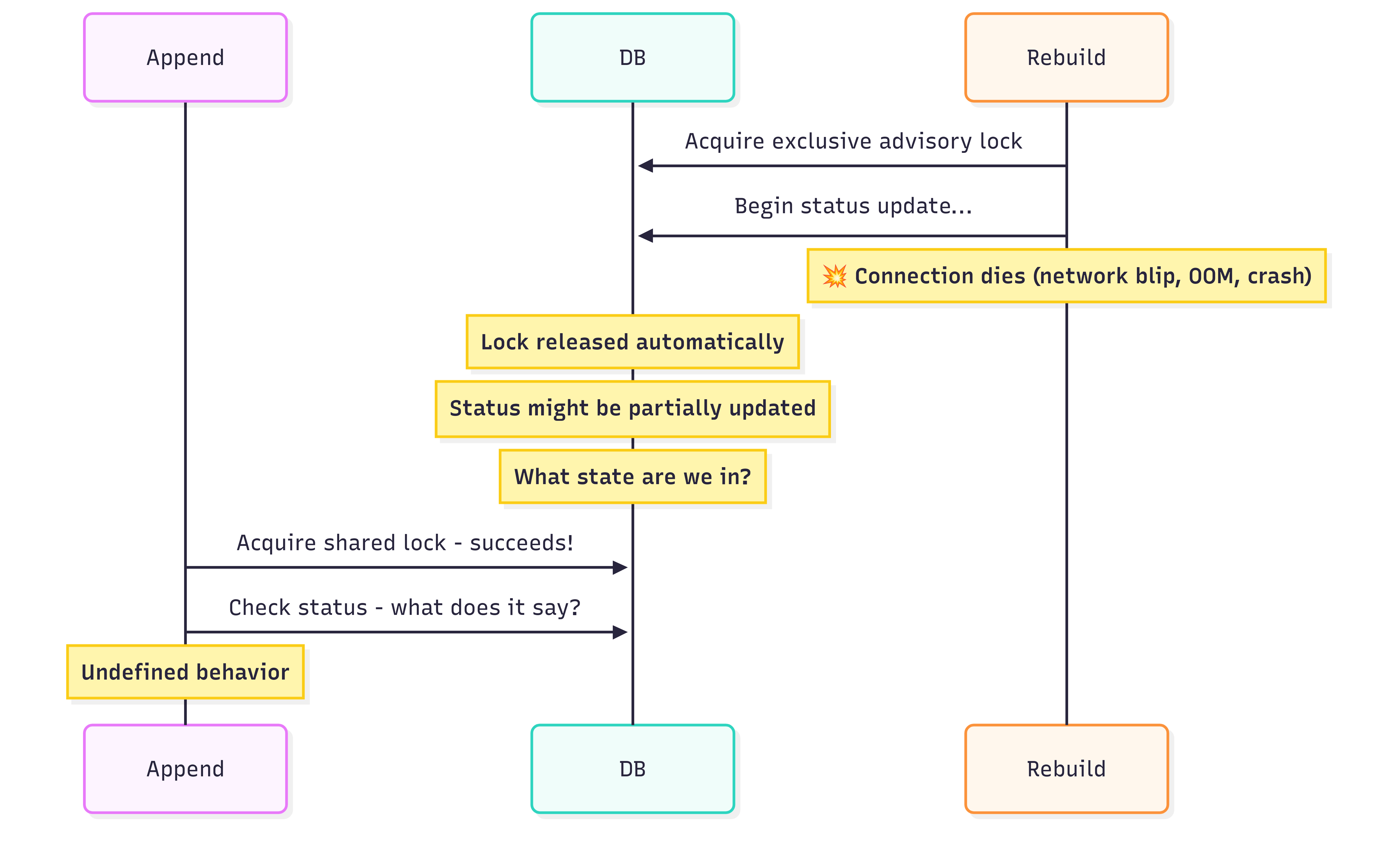 We can’t build reliable coordination on something that vanishes when connections fail. This is exactly why the original article combined advisory locks with persistent status checks—but that combination doesn’t solve this particular race condition.