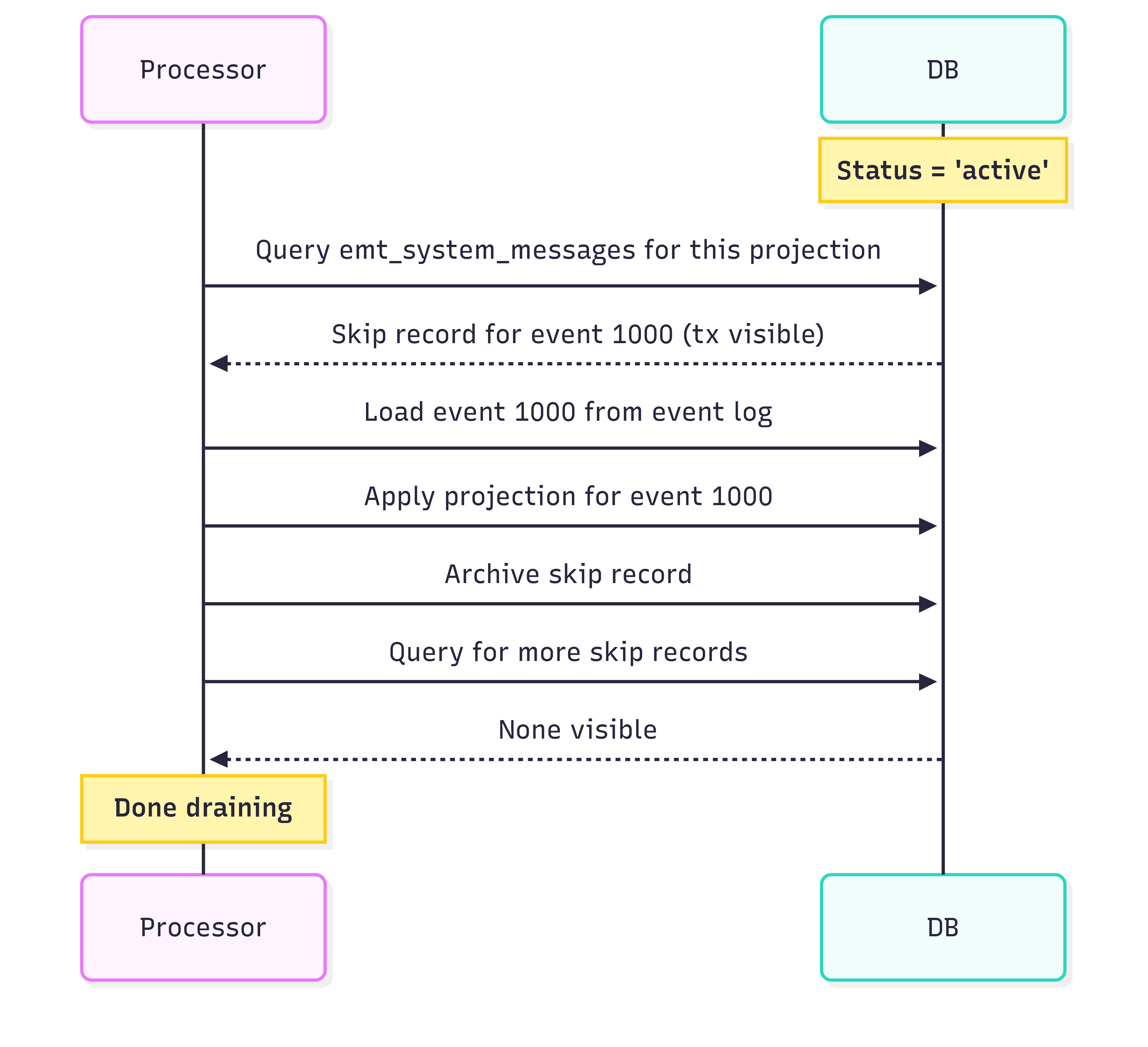 The drain process might find new skip records appearing. Transactions that were in flight during the status change, committed after we started draining. That’s fine. We keep querying until no more visible skip records exist. They will stop appearing as we alread stopped rebuilding processor, so no more inline projections should be skipped.