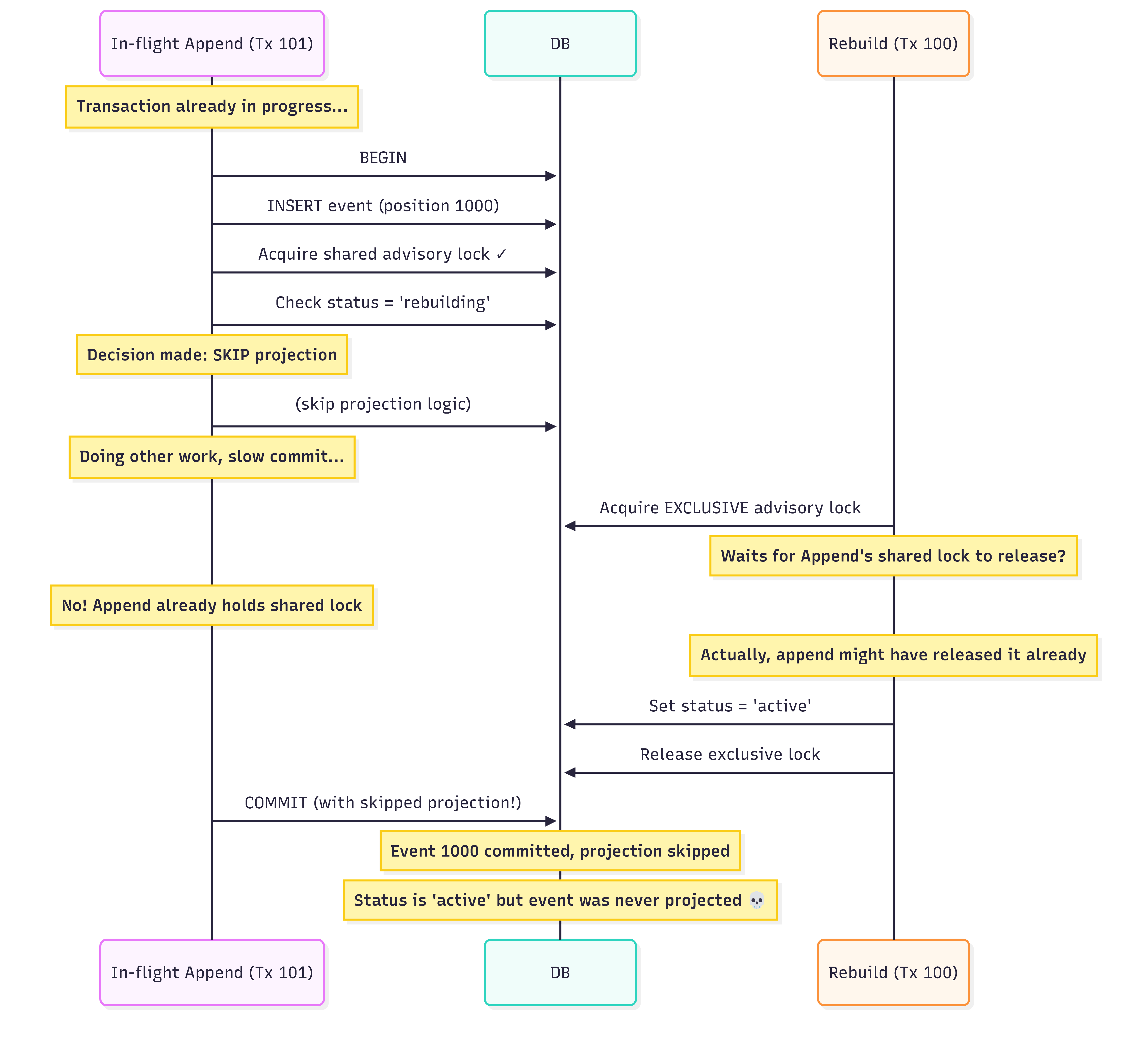 If we use transaction-scoped locks for inline projections (which makes sense—you want the lock tied to the transaction lifetime), then the append transaction might have already released its shared lock by the time we try to acquire an exclusive lock. The lock protected the status check, but the transaction is still running with its skip decision already made.