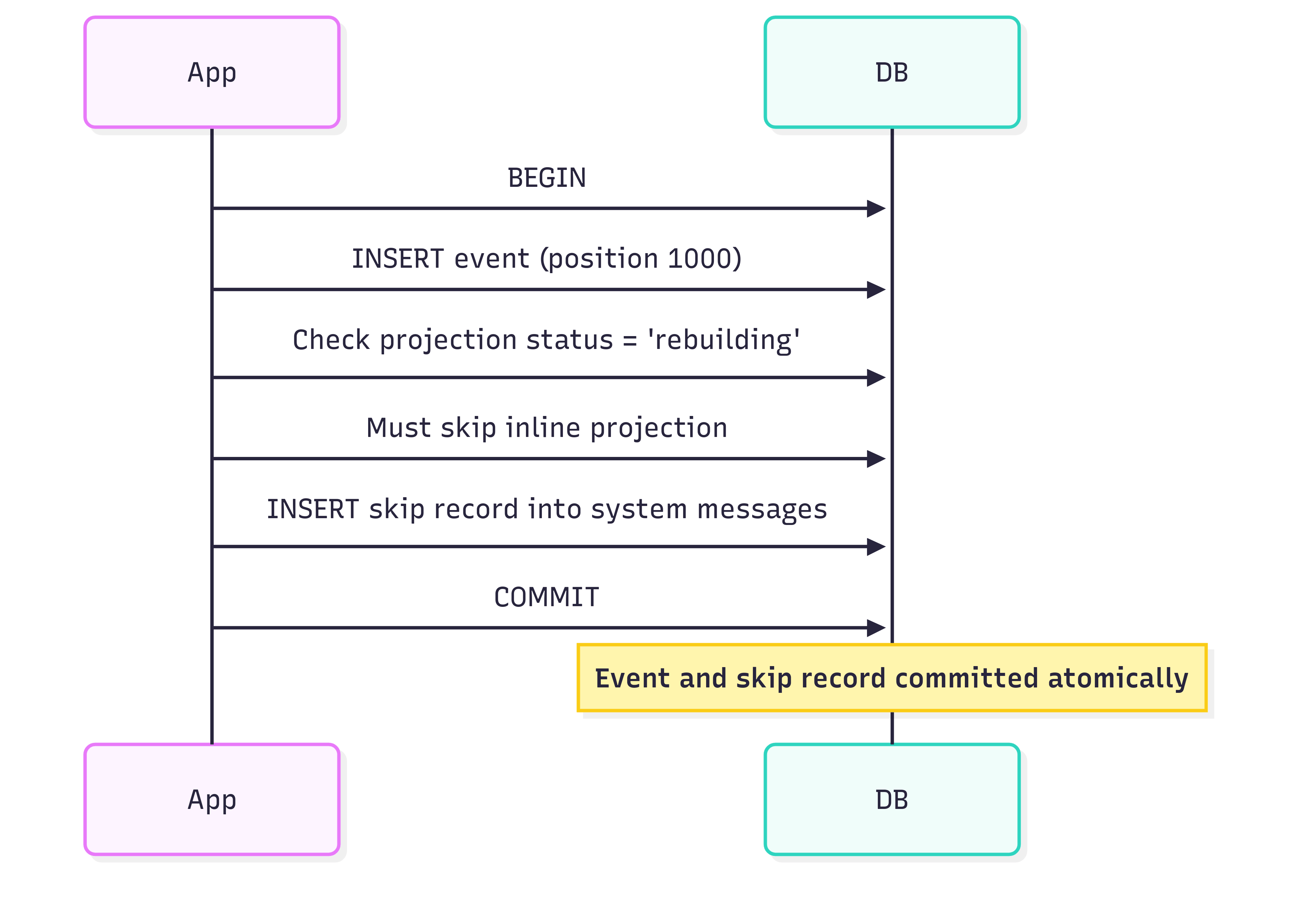 The skip record and the event are committed in the same transaction. This gives us a simple invariant: if an event exists, either its projection was applied inline (status was ‘active’) or a skip record exists (status was ‘rebuilding’). There’s no third option where an event exists without a trace.