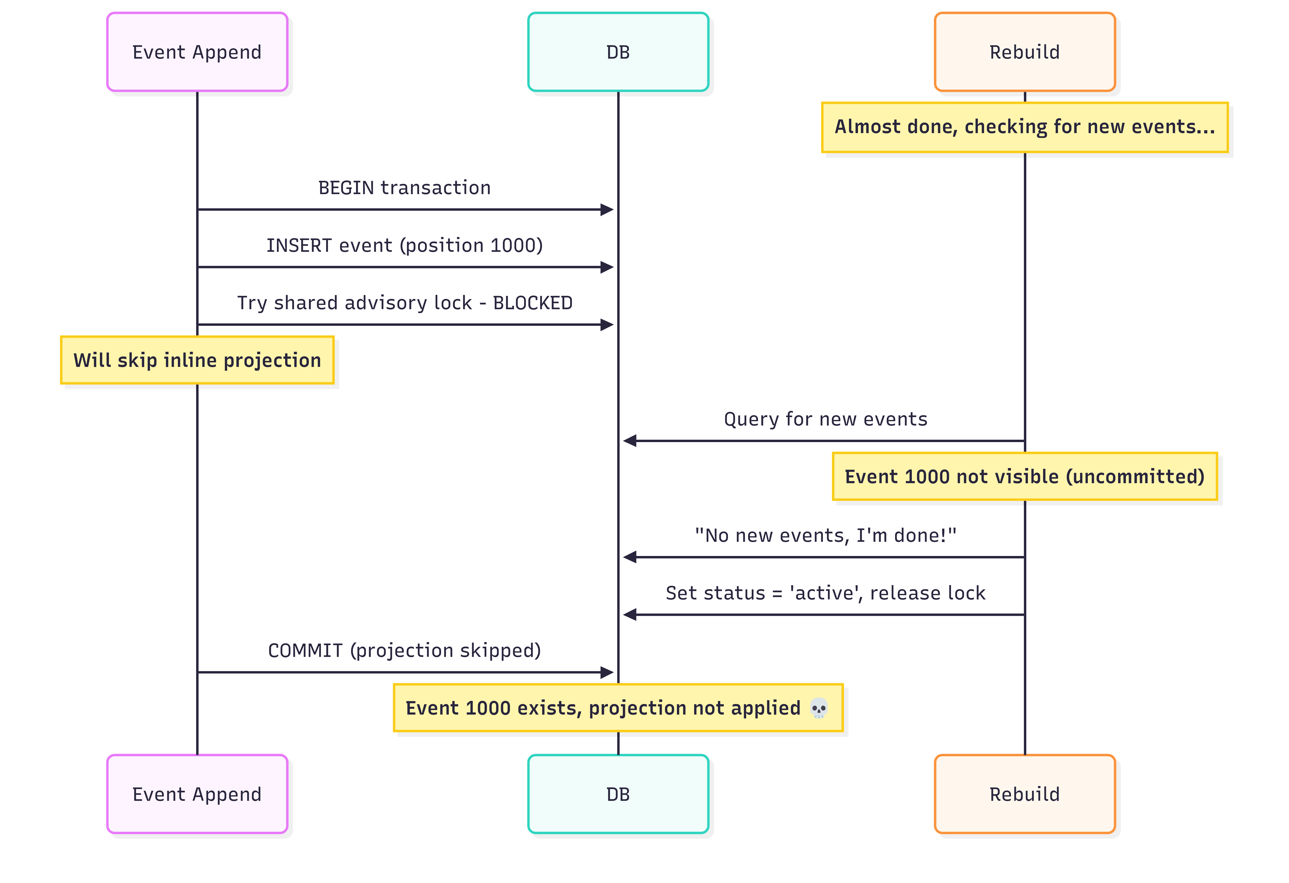 The rebuild process checks for new events, sees none (because event 1000 is still in an uncommitted transaction), declares victory, and sets the projection to active. Meanwhile, the append transaction has already decided to skip the inline projection. When it finally commits, the event exists but was never projected. The rebuild process is done, and only new events will update the projection during the next update to the new event append.